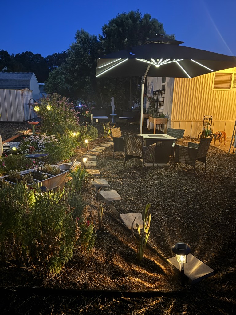 Outside has become something entirely its own. In the evenings, especially now that it’s spring, I open the umbrella and turn on the lights. Between the soft glow from above and the lights woven throughout the garden, everything changes. The yard lights up! It becomes calm, quiet, almost magical. The plants, the flowers, the feeders bringing in birds and hummingbirds—it all feels alive in a different way than during the day, a way that’s hard to explain unless you’re sitting in it. It’s not something that just happened; it’s been evolving over time. Some were happy accidents and others weren’t meant to go on to the next year.